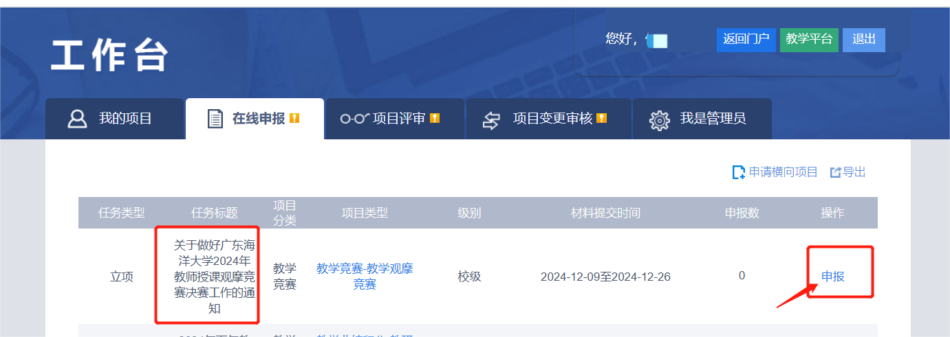 参赛选手须于2024年12月20~26日登录英国365集团网络教学平台的“教学类项目管理平台”,上传参赛课程的教学大纲、连续5个学时的课堂教学设计和与之相对应的课堂教学节段PPT。平台上项目名称为课程名称,如下图: