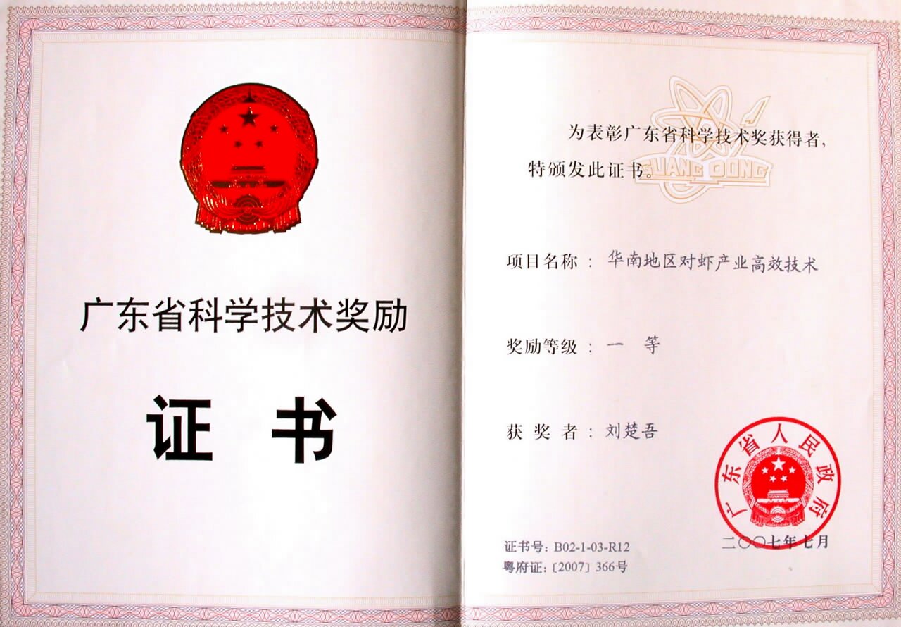 1、刘楚吾广东省科学技术奖励一等奖证书(华南地区对虾产业高效技术)2007年.jpg