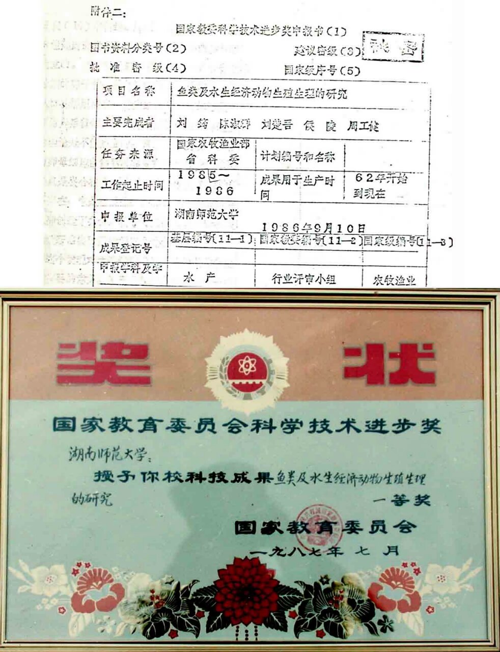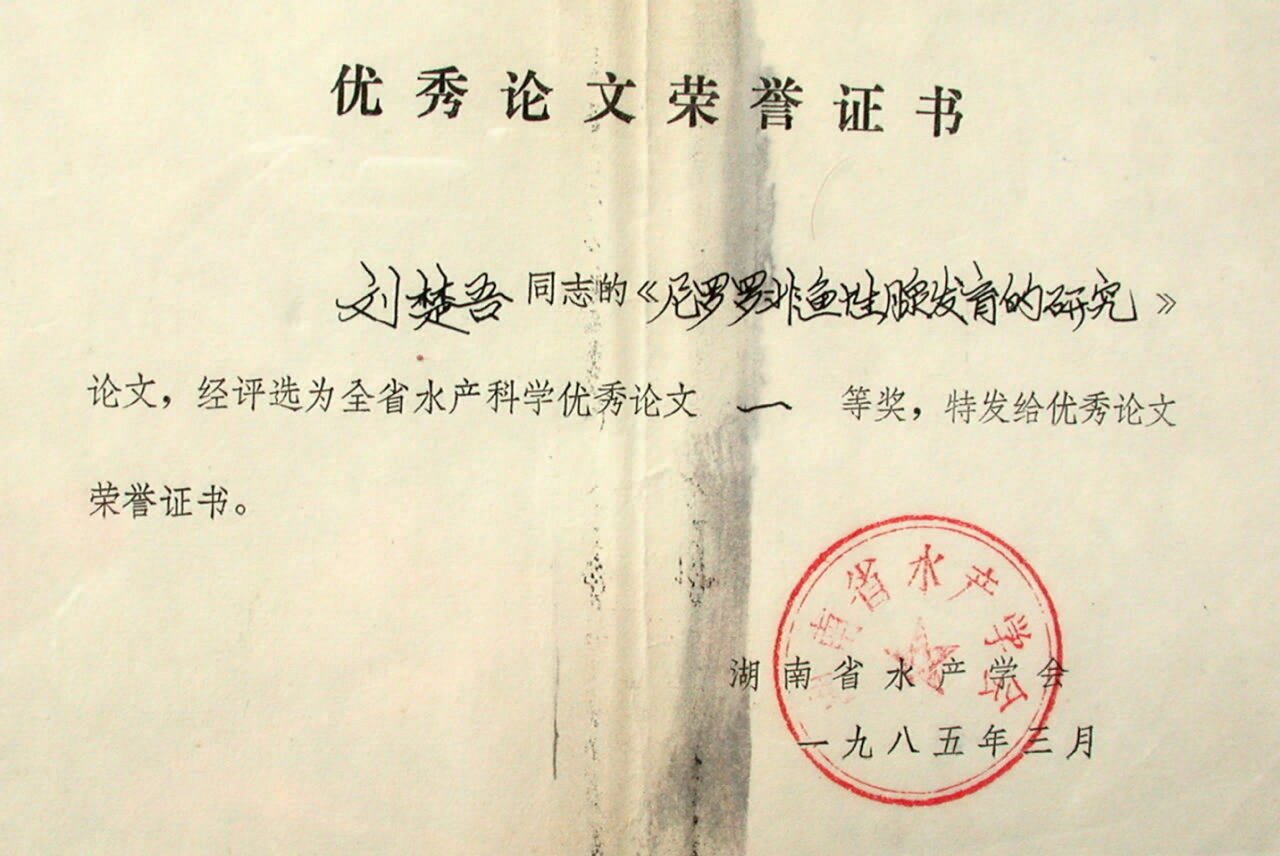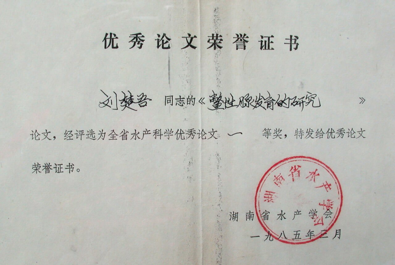 18、刘楚吾湖南省水产学会优秀论文《尼罗罗非鱼性腺发育的研究》一等奖1985年.jpg