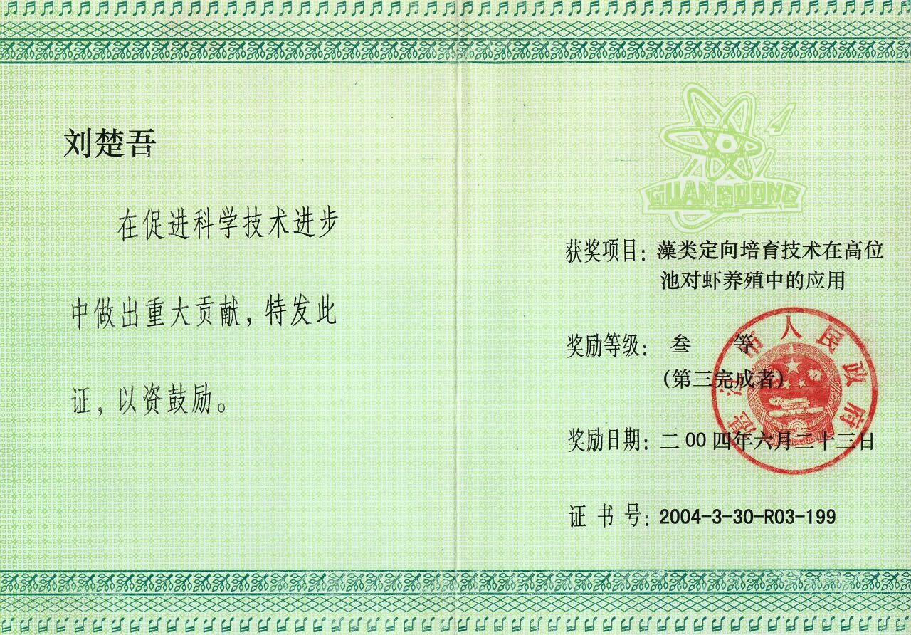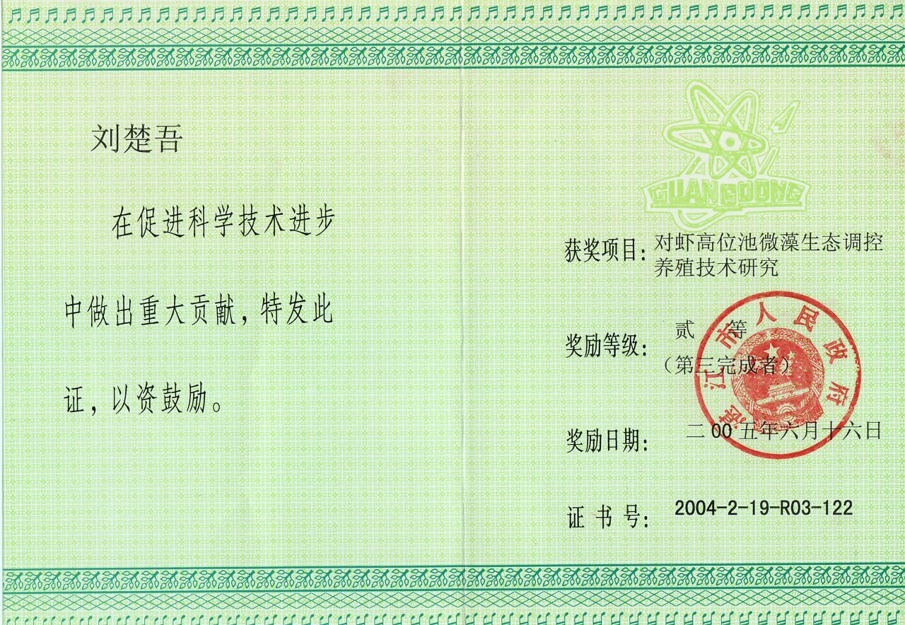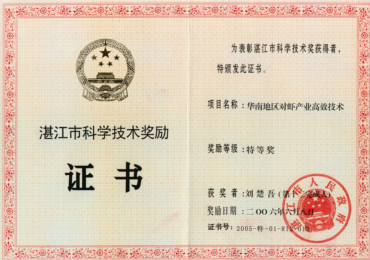 1、刘楚吾广东省科学技术奖励一等奖证书(华南地区对虾产业高效技术)2007年.jpg 2、刘楚吾湛江市科学技术奖励特等奖2006年.jpg 3、刘楚吾湛江市科技进步二等奖2005年.jpg 4、刘楚吾湛江市科技进步三等奖2004年.jpg 5、刘楚吾发明专利证书(军曹鱼仔稚鱼配合饲料)2004.jpg 6、刘楚吾中国水产学会学术会议论文三等奖2004年.jpg 7、刘楚吾广东省科学技术奖三等奖2002年.jpg 8、刘楚吾湛江市科学技术进步一等奖2001年.jpg 9、刘楚吾湖南省科学技术进步三等奖1992年.jpg 10、刘楚吾湖南省优秀青年科技工作者1991年.jpg 11、刘楚吾湖南省优秀青年科技工作者奖杯1991年.jpg 12、刘楚吾优秀专业技术工作者(湖南省)1990年.jpg 13、刘楚吾湖南省标准化科学技术进步二等奖1989年.jpg 14、刘楚吾国家教委科学技术进步奖一等奖1987年.jpg 15、刘楚吾农牧渔业部科技进步奖三等奖(集体)1986.jpg 16、刘楚吾农牧渔业部科技进步奖三等奖(个人)1986.jpg 17、刘楚吾湖南省水产学会优秀论文《鳖性腺发育的研究》一等奖1985年.jpg 18、刘楚吾湖南省水产学会优秀论文《尼罗罗非鱼性腺发育的研究》一等奖1985年.jpg 19、刘楚吾湖南科技成果三等奖(集体)1982年.jpg 20、刘楚吾国家水产总局技术改进成果二等奖1981年.jpg 21、刘楚吾湖南省科技进步二等奖(集体)1980年.jpg 22、刘楚吾湖南省科技进步二等奖(个人)1980年.jpg