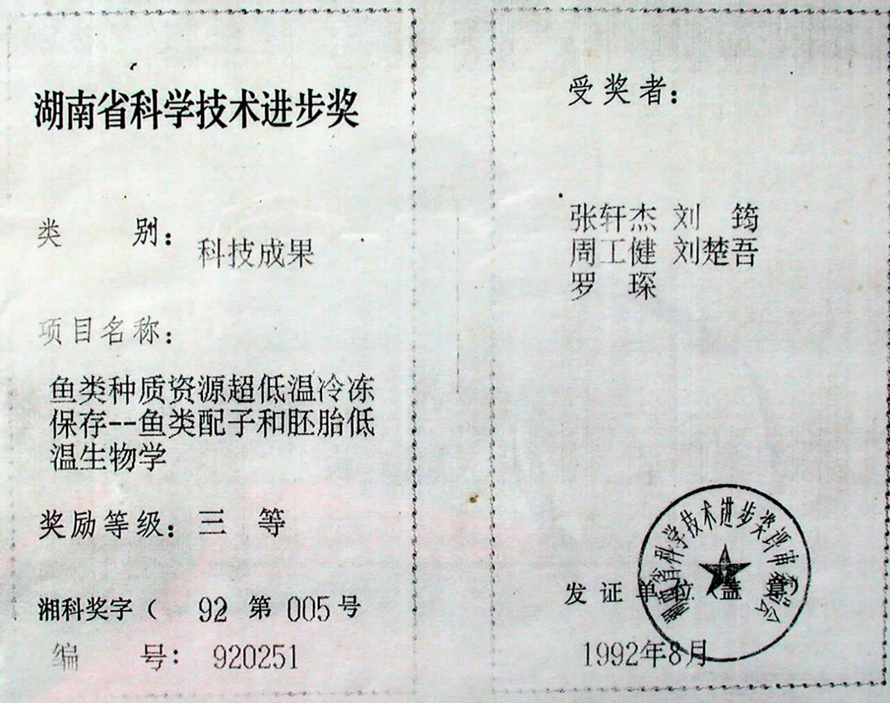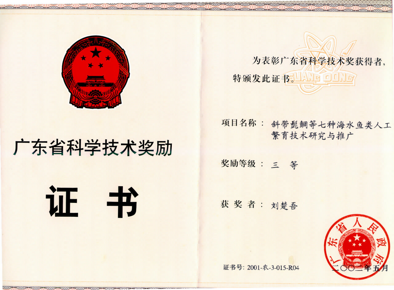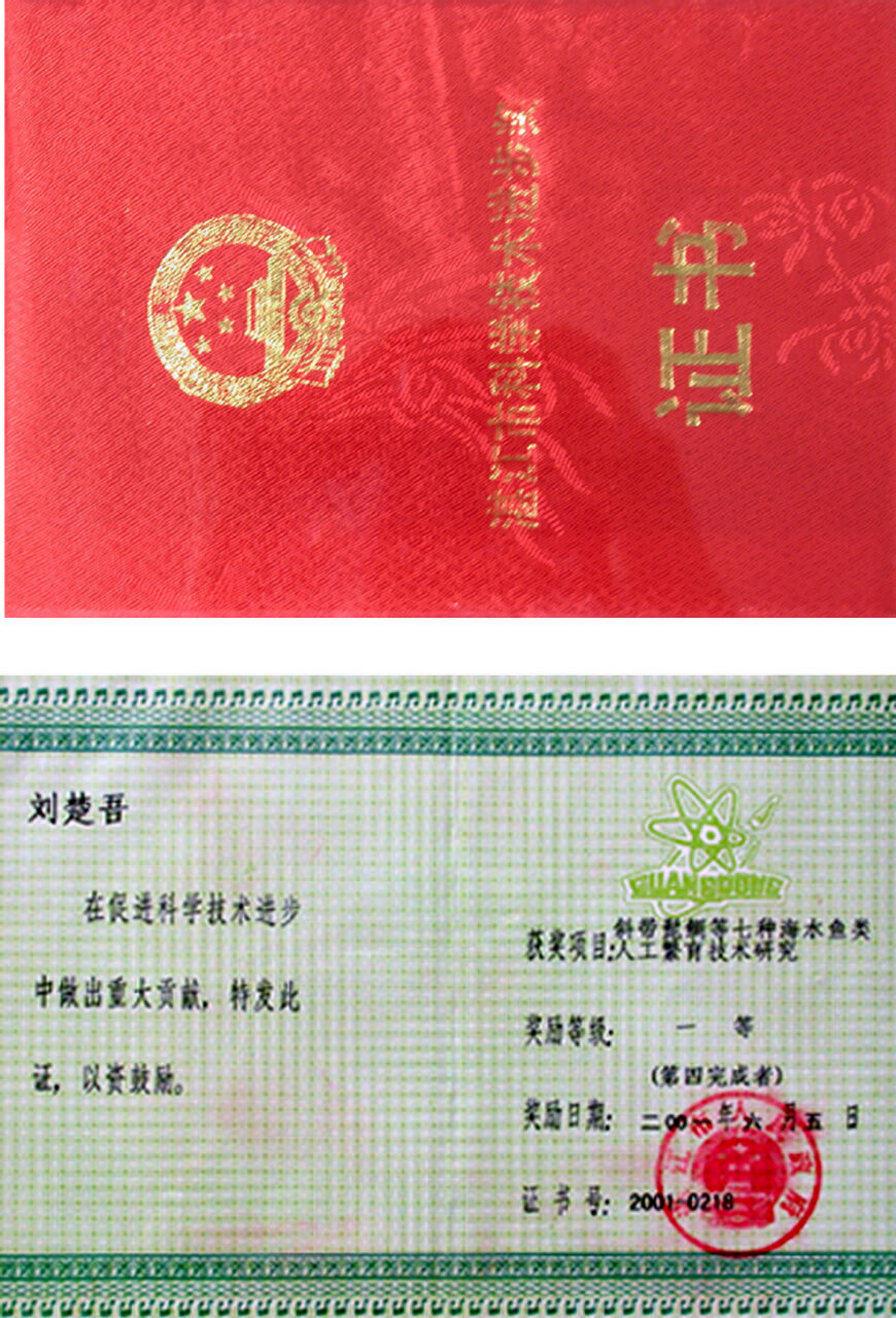 1、刘楚吾广东省科学技术奖励一等奖证书(华南地区对虾产业高效技术)2007年.jpg 2、刘楚吾湛江市科学技术奖励特等奖2006年.jpg 3、刘楚吾湛江市科技进步二等奖2005年.jpg 4、刘楚吾湛江市科技进步三等奖2004年.jpg 5、刘楚吾发明专利证书(军曹鱼仔稚鱼配合饲料)2004.jpg 6、刘楚吾中国水产学会学术会议论文三等奖2004年.jpg 7、刘楚吾广东省科学技术奖三等奖2002年.jpg 8、刘楚吾湛江市科学技术进步一等奖2001年.jpg 9、刘楚吾湖南省科学技术进步三等奖1992年.jpg 10、刘楚吾湖南省优秀青年科技工作者1991年.jpg 11、刘楚吾湖南省优秀青年科技工作者奖杯1991年.jpg 12、刘楚吾优秀专业技术工作者(湖南省)1990年.jpg 13、刘楚吾湖南省标准化科学技术进步二等奖1989年.jpg 14、刘楚吾国家教委科学技术进步奖一等奖1987年.jpg 15、刘楚吾农牧渔业部科技进步奖三等奖(集体)1986.jpg 16、刘楚吾农牧渔业部科技进步奖三等奖(个人)1986.jpg 17、刘楚吾湖南省水产学会优秀论文《鳖性腺发育的研究》一等奖1985年.jpg 18、刘楚吾湖南省水产学会优秀论文《尼罗罗非鱼性腺发育的研究》一等奖1985年.jpg 19、刘楚吾湖南科技成果三等奖(集体)1982年.jpg 20、刘楚吾国家水产总局技术改进成果二等奖1981年.jpg 21、刘楚吾湖南省科技进步二等奖(集体)1980年.jpg 22、刘楚吾湖南省科技进步二等奖(个人)1980年.jpg