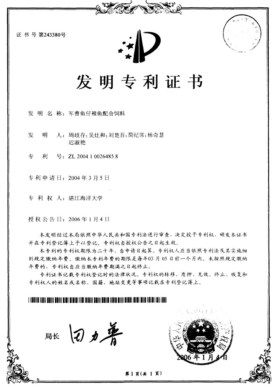 5、刘楚吾发明专利证书(军曹鱼仔稚鱼配合饲料)2004.jpg