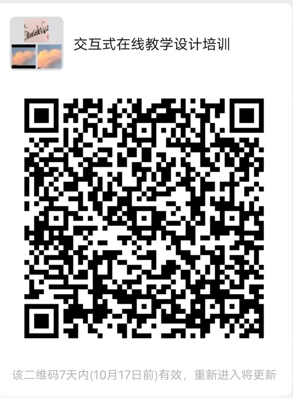 现请各单位(部门)组织教师报名,请参加培训的教师自行扫描“交互式在线教学设计培训报名表”进行报名接龙,并扫描“交互式在线教学设计培训”二维码进群,报名接龙截止时间:10月13日中午12:00前,联系人:姜晓丹,电话:13824824505。