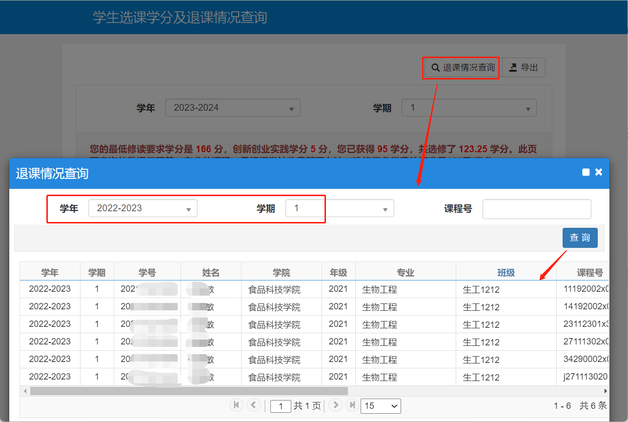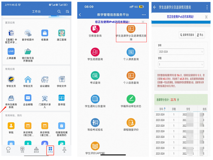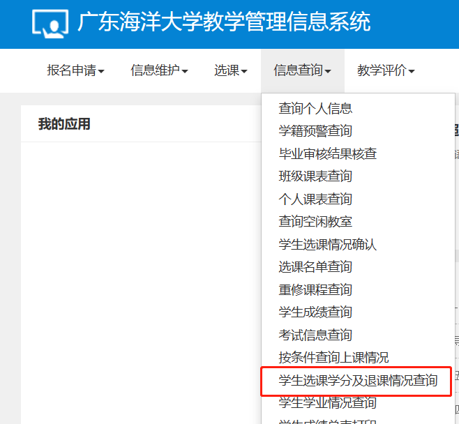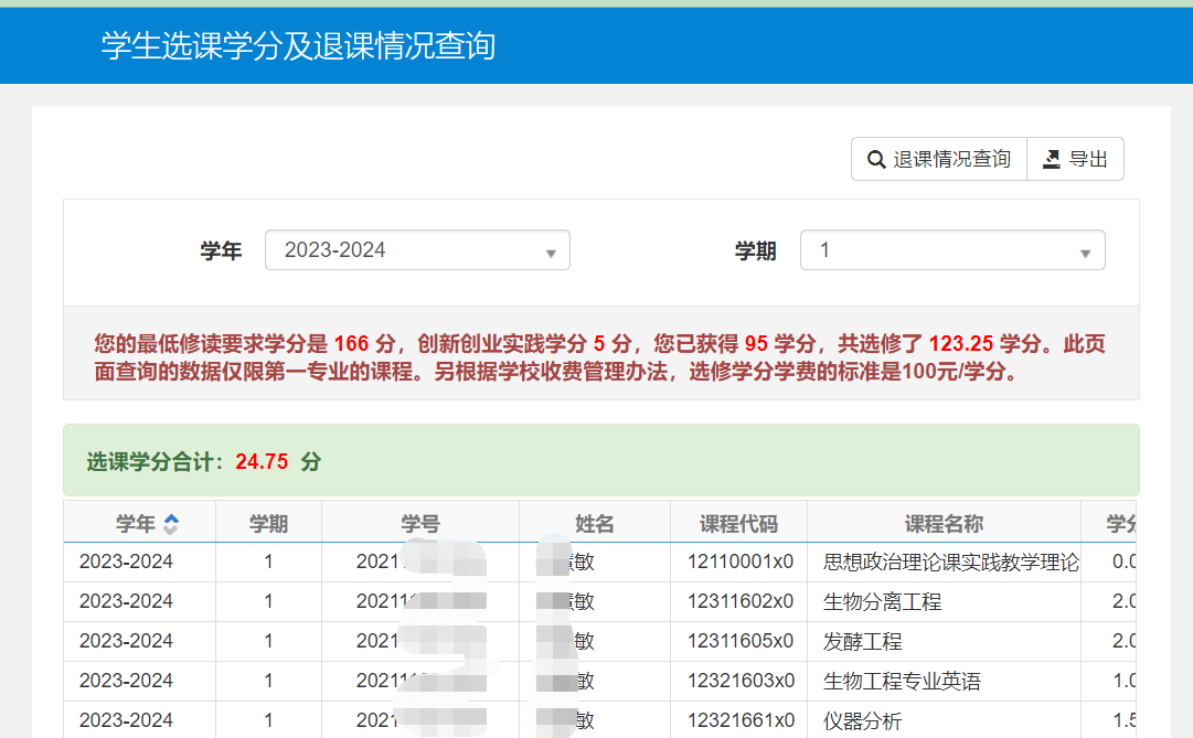 为了方便同学们查看选课学分以及退课情况,从即日起启用教学管理信息系统中的“学生选课学分及退课情况查询”页面,通过此页面可以清晰的查询每个学年学期的选课学分以及退课情况,支持电脑端和手机移动端查看,具体查询方式如下: