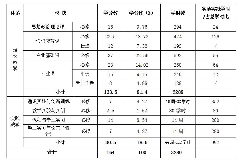 总学分:164。按规定修读完培养方案各模块课程,并获得相应学分,其中,思想政治理论课、通识教育必修课、专业基础课和专业必修(限选)课需按专业的指定要求修读。达到学士学位要求的全学程平均学分绩点2.0及以上。